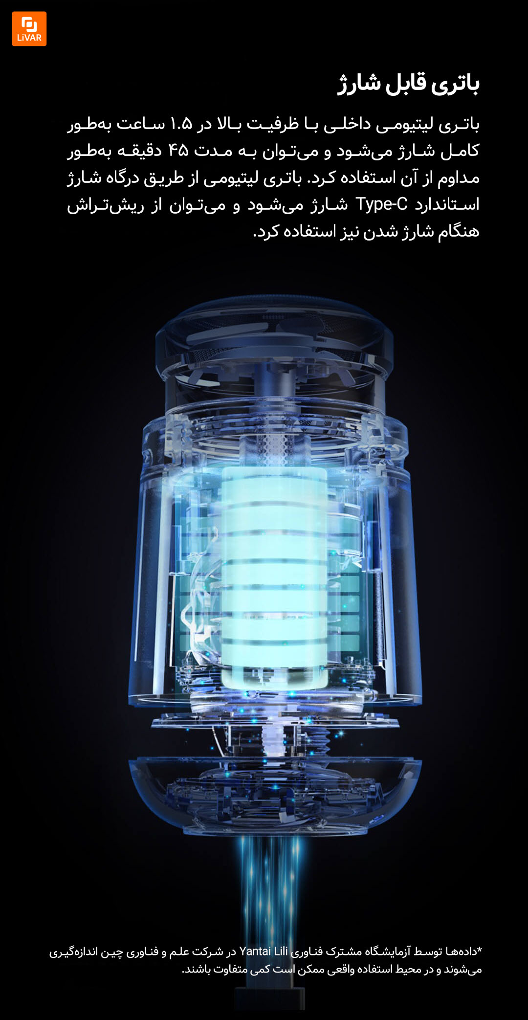 ریش تراش مینی LINGLEE دارای یک باتری لیتیوم یونی داخلی با ظرفیت بالا است که به شما این امکان را میدهد تا ۴۵ دقیقه بهطور مداوم از آن استفاده کنید. این باتری در ۱.۵ ساعت بهطور کامل شارژ میشود و میتوانید هنگام شارژ شدن نیز از دستگاه استفاده کنید. ریشتراش LINGLEE از طریق درگاه شارژ استاندارد Type-C شارژ میشود.