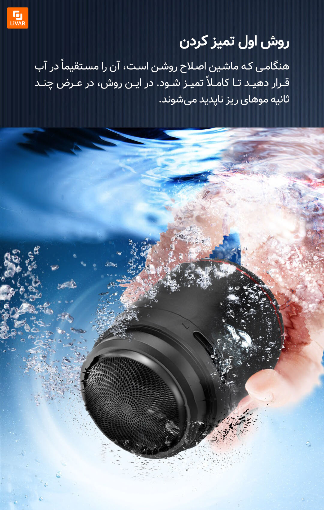 هنگامی که ماشین اصلاح روشن است، آن را مستقیماً در آب قرار دهید تا کاملاً تمیز شود.