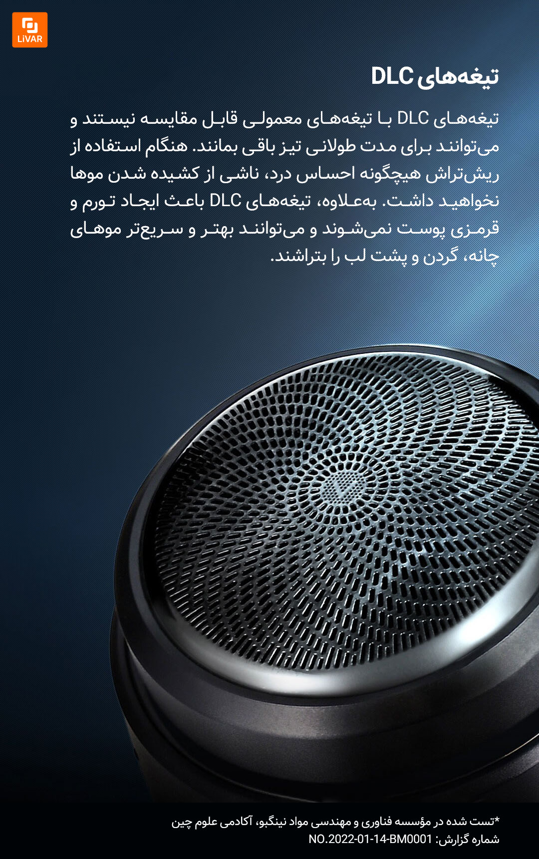 تیغههای الماسمانند (DLC) مدت طولانیتری نسبت به تیغههای معمولی تیز باقی میمانند. هنگام استفاده از ریشتراش هیچگونه احساس درد، ناشی از کشیده شدن موها نخواهید داشت. با وجود تیغههای DLC نگرانی در مورد ایجاد تحریک، تورم و قرمزی پوست خود نداشته باشید و با خیال راحت از ریشتراش استفاده کنید.