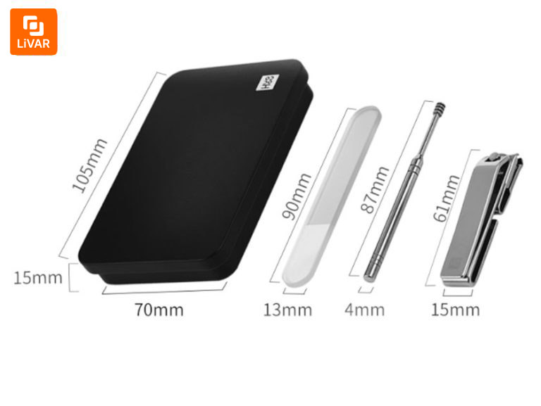 جعبه: ۱۰۵*۱۵*۷۰ میلیمتر سوهان ناخن: ۱۳*۳*۹۰ میلیمتر گوش پاککن: ۴*۸۷ میلیمتر ناخنگیر: ۱۵*۱۲*۶۱ میلیمتر |
