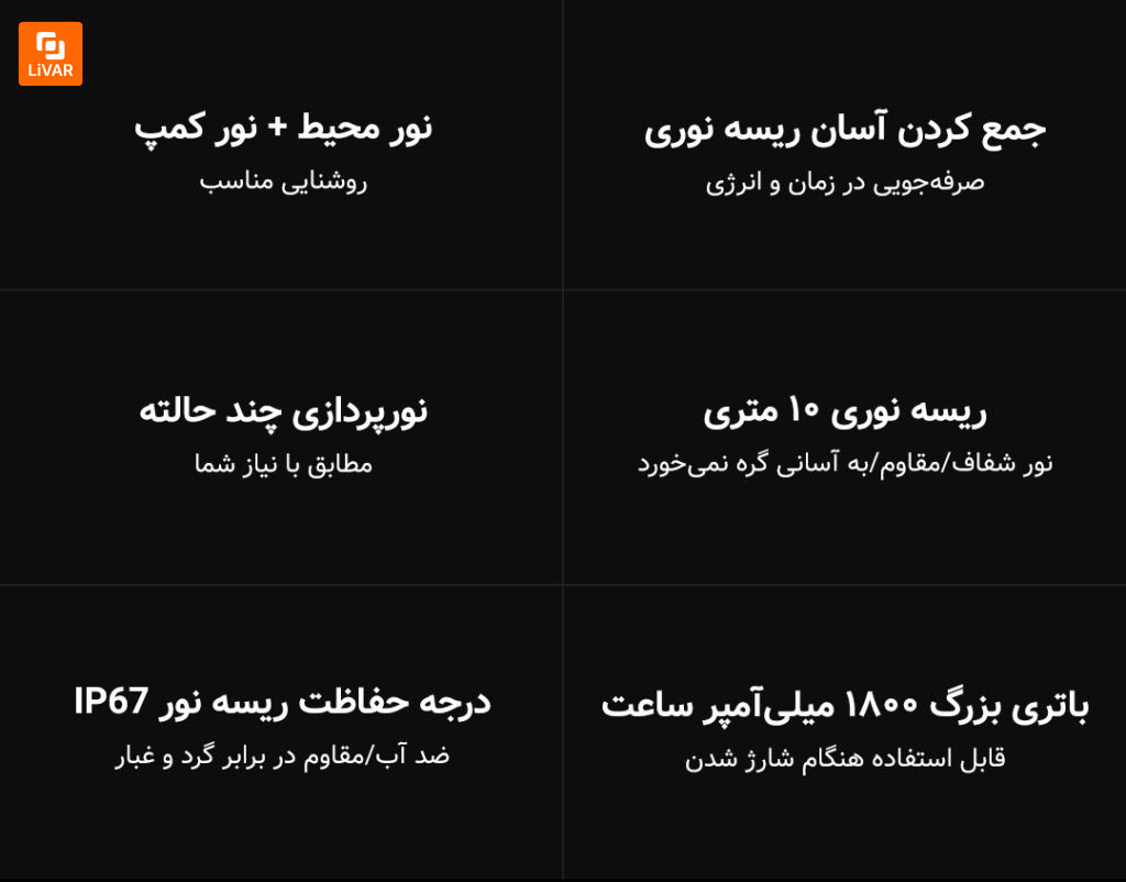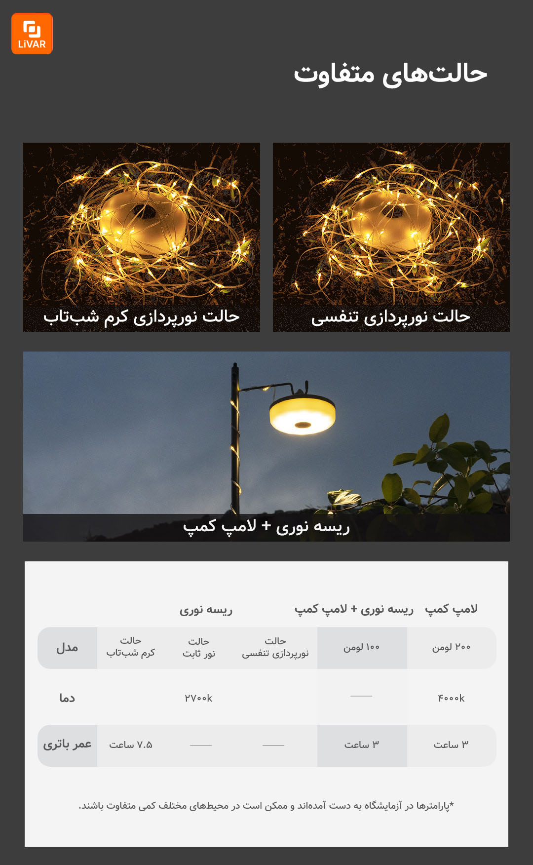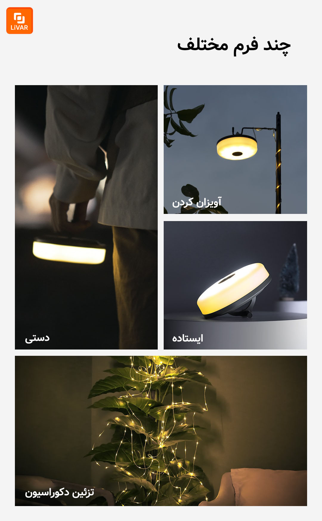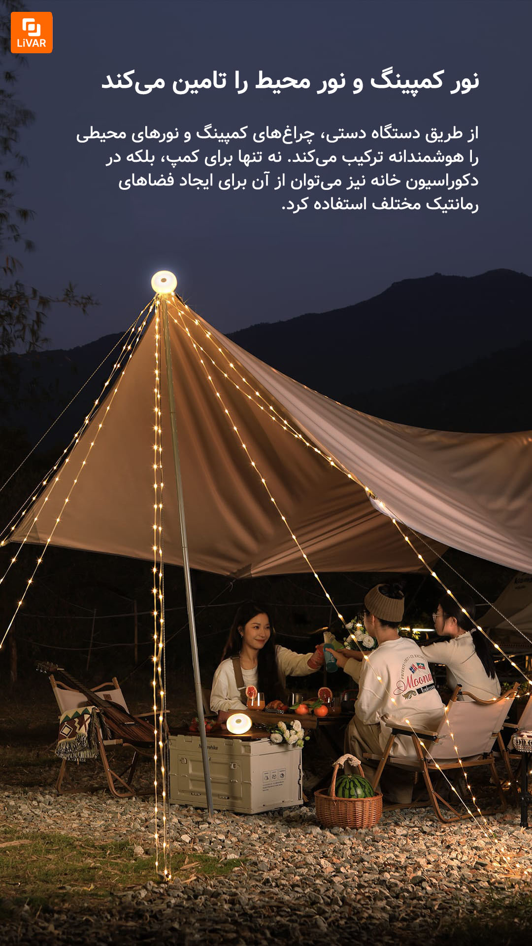 از طریق دستگاه دستی، چراغهای کمپینگ و نورهای محیطی را هوشمندانه ترکیب میکند. نه تنها برای کمپ، بلکه در دکوراسیون خانه نیز میتوان از آن برای ایجاد فضاهای رمانتیک مختلف استفاده کرد.