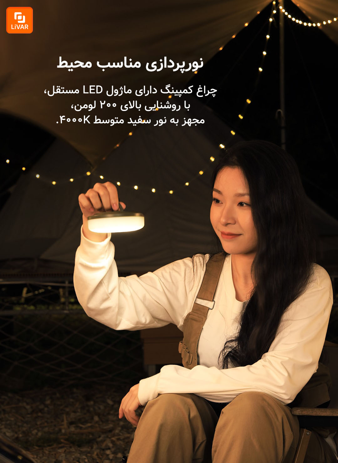 چراغ کمپینگ دارای ماژول LED مستقل، با روشنایی بالای ۲۰۰ لومن، مجهز به نور سفید متوسط 4000K.