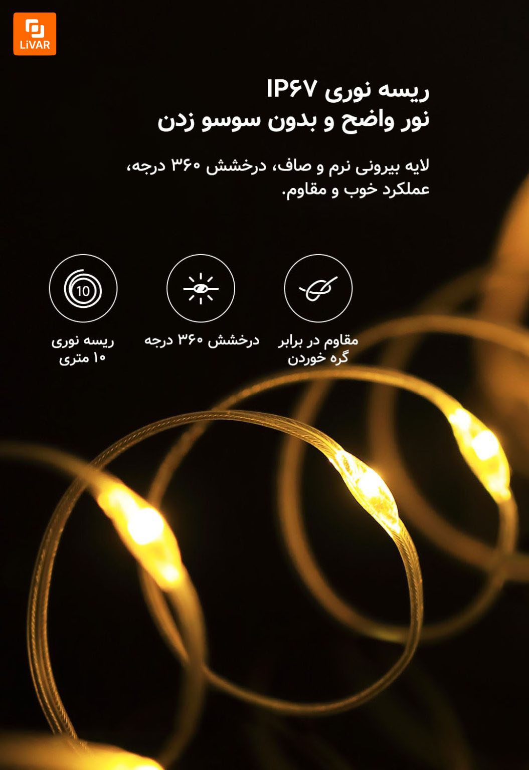 لایه بیرونی نرم و صاف، درخشش ۳۶۰ درجه، عملکرد خوب و مقاوم. طول ریسه نوری به ۱۰ متر میرسد.