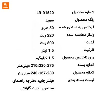 دمنوش ساز برقی Liren مدل LR-D1520 یک دستگاه عالی برای تهیه دمنوشهای مختلف با استفاده آسان و کارایی بالا است. این دستگاه با طراحی زیبا و امکانات متعدد، تجربهای لذتبخش از تهیه دمنوش را برای شما به ارمغان میآورد. یکی از ویژگیهای بسیار خوب این دستگاه کاربرد بالای آن است. یعنی شما با خرید یک دمنوش ساز حرفهای یک چای ساز زیبا و جذاب هم خریداری کردهاید. این ویژگی باعث میشود تا هم در هزینه شما صرفهجویی شود و هم در فضای اشغال شده در آشپزخانه این اتفاق بیفتد.